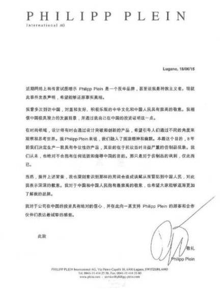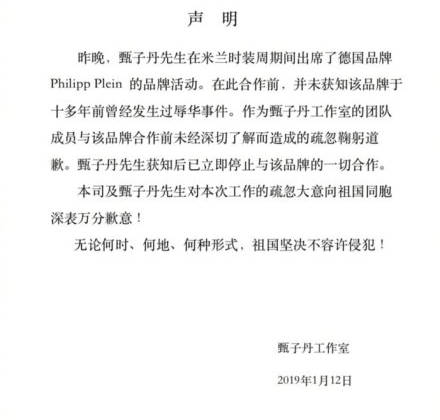 Sau khi tin tức này bị tiết lộ, studio của Chân Tử Đan cũng phản ứng rất nhanh, phía studio này lập tức đăng đàn thanh minh trên weibo, rằng Chân Tử Đan không hề biết đến vụ việc nhục mạ người Trung Quốc 10 năm về trước của Philipp Plein khi tham gia hoạt động của thương hiệu này.