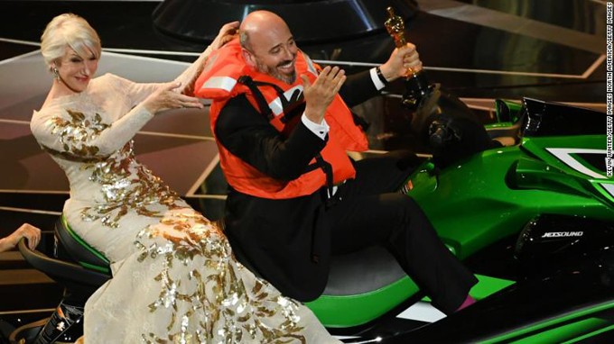Đó là một chiếc mô tô nước mới cứng trị giá 18.000 USD (tương đương hơn 400 triệu VNĐ). Ngay từ đầu lễ trao giải, MC Jimmy Kimmel đã giới thiệu phần thưởng thú vị kèm lời nhắn: “Tôi sẽ tính giờ các bạn!”.