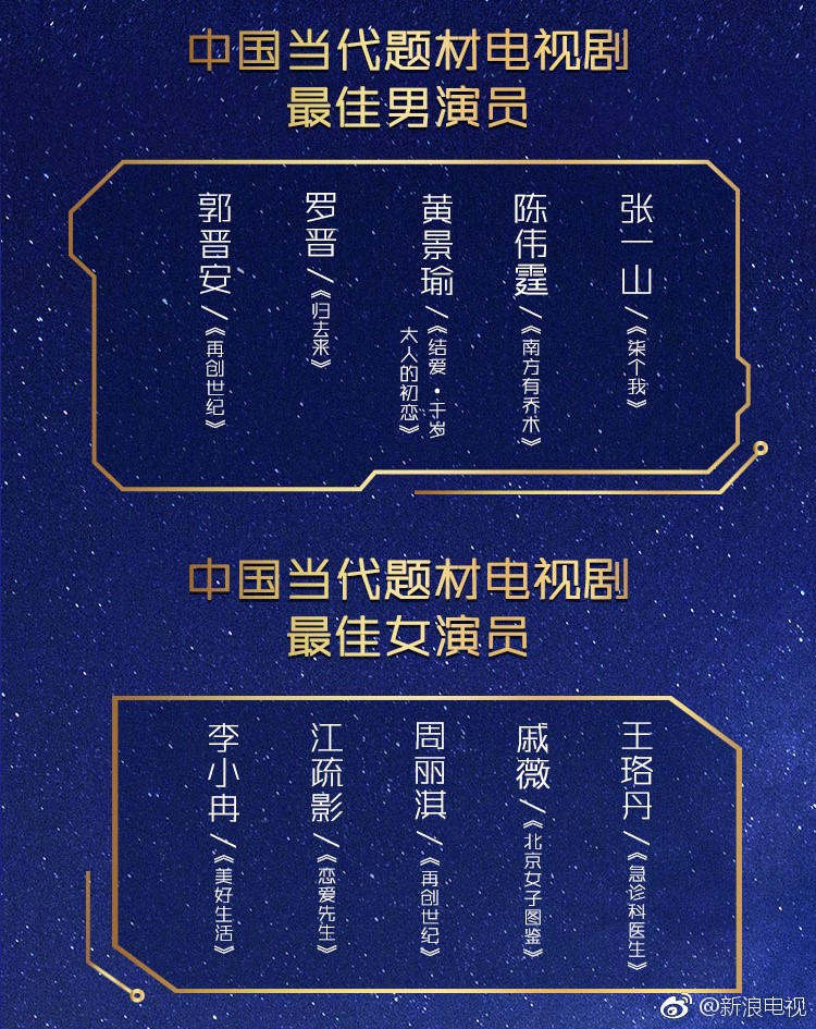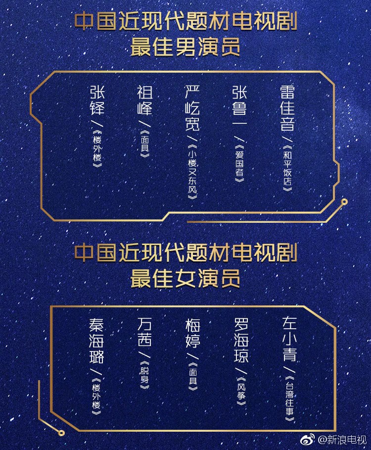 Hai hạng mục diễn viên xuất sắc bên dòng phim dân quốc và hiện đại bao gồm những cái tên đình đám như Trương Dịch và Tần Hải Lộ (Lâu ngoại lâu), Tổ Phong và Mai Đình (Mặt nạ), Quách Tấn An và Châu Lệ Kỳ (Tái sáng thế kỷ), La Tấn (Quy khứ lai), Giang Sơ Ảnh (Tiên sinh tình yêu). Trần Vỹ Đình và Hoàng Cảnh Du là hai chàng tiểu sinh đình đám trên màn ảnh cũng được đề cử lần lượt với phim Nam phương hữu kiều mộc và Tình đầu của thiên tuế đại nhân. Tuy nhiên nhiều netizen cho rằng diễn xuất của cả hai đều không bằng Cận Đông trong Tiên sinh tình yêu, việc thiếu vắng tên của Cận Đông cũng khiến nhiều người bất bình.
