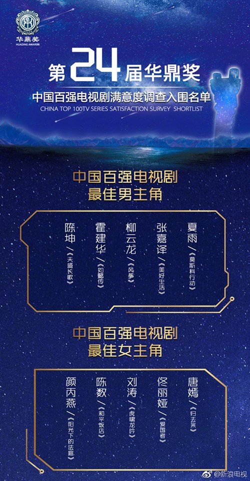 Mới đây, danh sách đề cử chính thức của giải Hoa Đỉnh năm nay đã được công bố. Hạng mục Nam diễn viên chính xuất sắc nhất (Thị đế) gồm có Trần Khôn (Thiên thịnh trường ca), Hoắc Kiến Hoa (Hậu cung Như Ý truyện), Liễu Vân Long (Phong tranh), Trương Gia Dịch (Cuộc sống tươi đẹp) và Hạ Vũ (Hành động Moscow). Còn hạng mục Nữ diễn viên chính xuất sắc nhất (Thị hậu) gồm có Nhan Bính Yến (Pháp đình dưới ánh mặt trời), Trần Số (Quán cơm hòa bình), Lưu Đào (Quân sư liên minh), Đồng Lệ Á (Người yêu nước) và Đường Yên (Quy khứ lai).