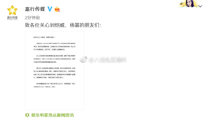 Thế nhưng ngay sau khi bác bỏ tin đồn thì cách đây ít phút weibo chính thức của truyền thông Gia Hành đã đăng lên bài thông báo cho biết cả hai đã chính thức ly hôn trong năm nay diễn ra trong hòa bình, kết thúc mối quan hệ hôn nhân của cả hai.