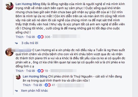 “Đây là đồng nghiệp của mình là người nghệ sĩ mà mình kính trọng nhất về nhân cách bên cạnh sự cảm phục. Cuộc sống quá khó khăn nhưng chưa bao giờ oán thán chưa bao giờ nhận sự giúp đỡ của ai. Cứ nhìn Bôm là mình lại ứa nước mắt. Còn khi diễn trên sân khấu và màn ảnh thì cũng hết mình vậy mà cát sỏi nó dám lôi cái nghề của chúng mình ra để mạt sát thế mình thấy thật thiếu văn hoá. Như vậy là xúc phạm tất cả anh em nghệ sĩ diễn viên rồi. Chúng tôi khóc, cười cũng là để mang những giá trị tốt đẹp cho cuộc sống chứ…” - NSND Lan Hương viết.