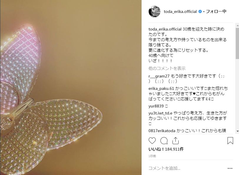 Người hâm mộ đã rất lo lắng không hiểu có chuyện gì xảy ra với nữ diễn viên. Giải thích về hành động đường đột này, Toda đã trải lòng: “Tôi đã quyết định làm điều này khi bước sang tuổi 30. Từ giờ trở đi, tôi sẽ quăng hết suy tư và những thứ mình có một cách nhiều nhất có thể. Sau tất cả, tôi cần khởi động lại để tiến lên. Hướng tới tuổi 40 nào!!!”.