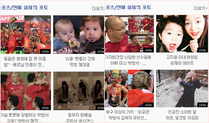 Tin giải trí và thể thao được quan tâm. Những tin giải trí về diễn viên Han Ye Seul, vợ và con trai của ca sĩ Ko Ji Yong (SECHSKIES): Ko Seung Jae, Heo Yang Im. Con gái của vợ chồng diễn viên In Gyo Jin - So Yi Hyun, và hai em bé của chương trình “Siêu nhân trở lại”. Về tin thể thao: bàn thắng của đội Việt Nam và nụ hôn vô tình của Park Hang Seo và Văn Quyết…