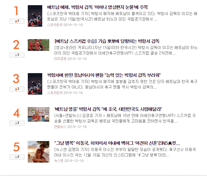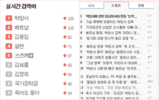 Cho đến hiện tại, cơn “sốt” về trận đấu bóng đá của đội tuyển Việt nam vẫn chưa hạ nhiệt tại xứ Kim Chi. Sau hơn 15 giờ đồng hồ (tính đến 12:30 trưa ngày 16/12/2018), mọi thông tin về Việt Nam và Park Hang Seo vẫn được nhiều hãng truyền thông lớn nhỏ cập nhật liên tục. Bên mục thể thao ở cổng thông tin nổi tiếng nhất tại Hàn Quốc - NATE, báo cáo về trận đấu vẫn duy trì vị trí dẫn đầu. Xếp hạng tin tức được nhiều người quan tâm nhất.
