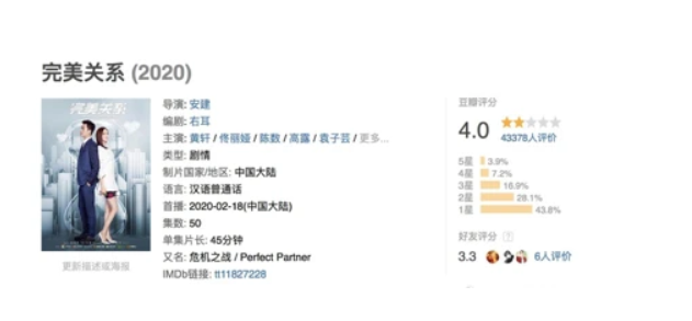 Chỉ trong vòng chưa đầy 1 tháng, điểm Douban bộ phim Quan hệ hoàn mỹ (完美关系) nhanh chóng tụt xuống chỉ còn 4,0. Chiến tích này đối với nữ chính Đồng Lệ Á mà nói có lẽ là lần trượt dốc lớn nhất trong sự nghiệp diễn xuất của cô.