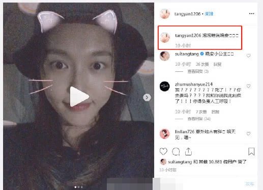 Hôm nay (16.07), Đường Yên cập nhật trạng thái trên Instagram cùng với bức ảnh tạo dáng đáng yêu. Nữ diễn viên mặc áo màu đen với chiếc mũ cùng màu, selfie với bộ lọc tai mèo. Ngoài ra, còn có thêm bức ảnh chụp bóng lưng và đôi chân của cô, thế nhưng cả ba bức ảnh đều giấu vòng 2 giữa tin đồn Đường Yên mang thai được lan truyền trên mạng.