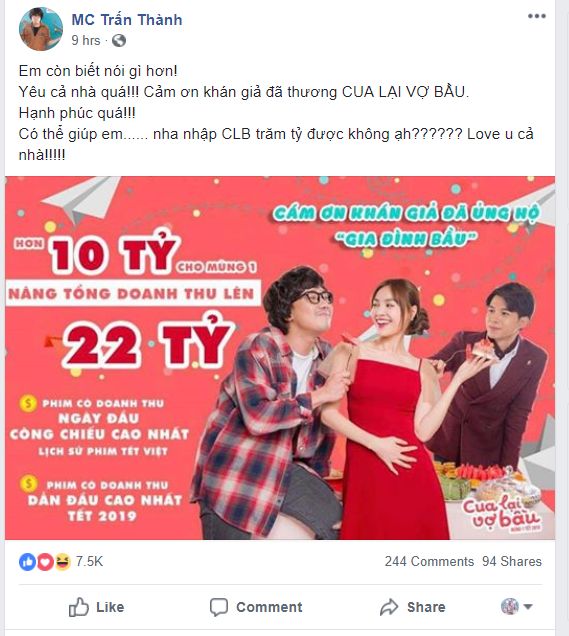 Phát ngôn này không chỉ phủ nhận nghi án nói trên mà còn làm dấy thêm cuộc chiến mới: Con số thực của doanh thu phòng vé. Bởi lẽ, vào chiều ngày mồng Hai Tết - trước khi drama được Trấn Thành châm lửa, hai phim Trạng Quỳnh và Cua lại vợ bầu cùng công bố doanh thu 10 tỷ đồng, kèm theo nhiều mỹ từ như “top 1 doanh thu phim Việt phòng vé mùng Một Tết”, “phim có doanh thu ngày đầu công chiếu cao nhất lịch sử phim Tết Việt”.
