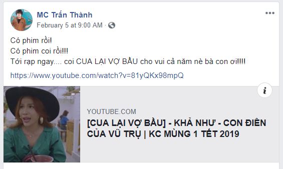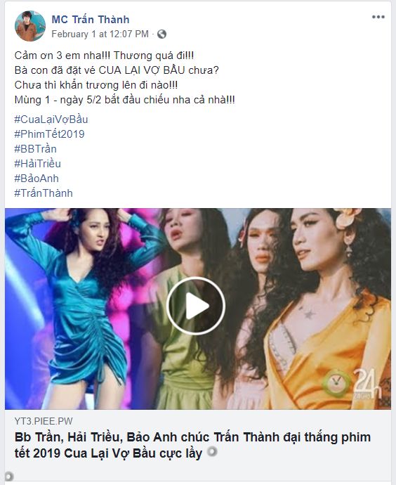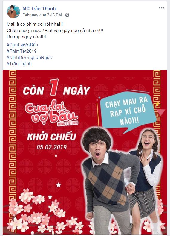 Mùa phim Tết 2019 đã từng được nhiều người kỳ vọng “sẽ làm nên chuyện” khi có màn xông đất đầu năm của Trấn Thành trong hai phim chiếu rạp: Cua lại vợ bầu và Trạng Quỳnh. Ở mỗi phim, ông xã của Hari Won đã thể hiện màu sắc khác nhau, hứa hẹn khiến người xem phải bất ngờ về lực diễn của mình.