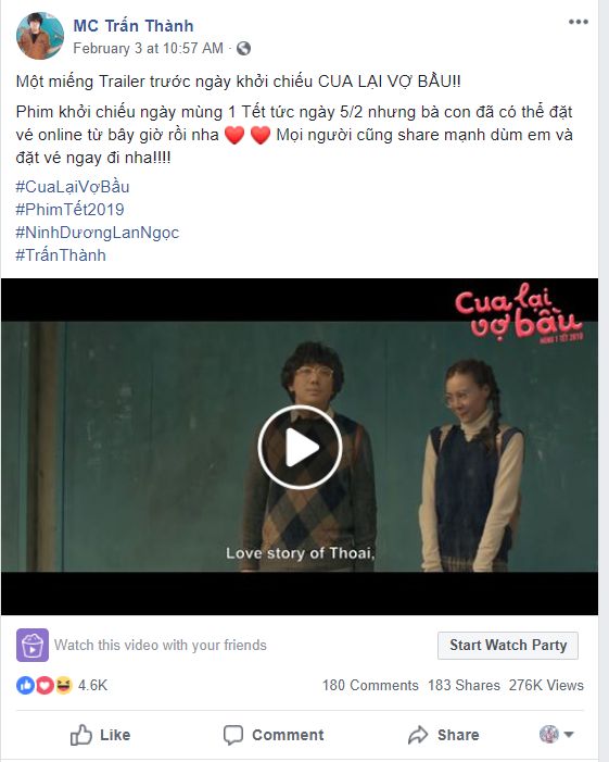 Chỉ cần lướt fanpage chính thức của Trấn Thành, công chúng sẽ dễ dàng thấy được sự ưu ái của A Xìn dành cho bộ phim đóng cùng với Ninh Dương Lan Ngọc. Từ những ngày đầu, số lượng bài viết dành cho Cua lại vợ bầu nhiều hơn hẳn so với Trạng Quỳnh. Cho đến hiện tại, anh Xẩm chỉ đăng duy nhất hai bài đăng cho ảnh của họp báo ra mắt phim Trạng Quỳnh, trong khi ở Cua lại vợ bầu, anh quảng bá từ clip viral, tình trạng đặt vé cho đến lịch trình cinetour.