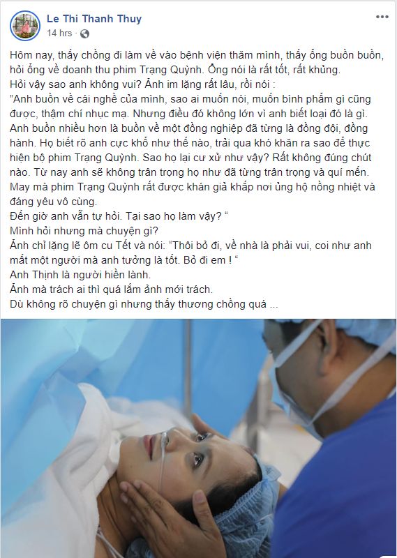 “Hôm nay, thấy chồng đi làm về vào bệnh viện thăm mình, thấy ổng buồn buồn, hỏi ổng về doanh thu phim Trạng Quỳnh. Ổng nói là rất tốt, rất khủng. Hỏi vậy sao anh không vui? Ảnh im lặng rất lâu, rồi nói: