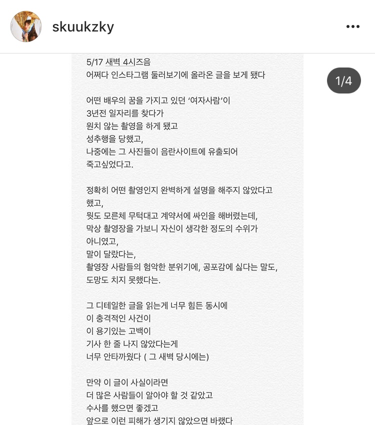 Đơn khởi kiện bắt nguồn từ sự việc một YouTuber có tên Yang Ye Won chia sẻ câu chuyện mình bị quấy rối tình dục bởi hai mươi người đàn ông của cùng một studio nhiếp ảnh từ ba năm trước. Ngay sau khi sự việc được công khai, nữ ca sĩ đã ký vào đơn kiến nghị gửi đến Nhà Xanh nhằm yêu cầu cơ quan chức năng vào cuộc điều tra vụ án. Đồng thời, Suzy cũng đã công khai chữ ký của mình lên Instagram cá nhân. Sau khi chia sẻ, số lượng người kí đơn kiến nghị đã tăng vọt từ 16 nghìn lên đến hơn 188 nghìn người.