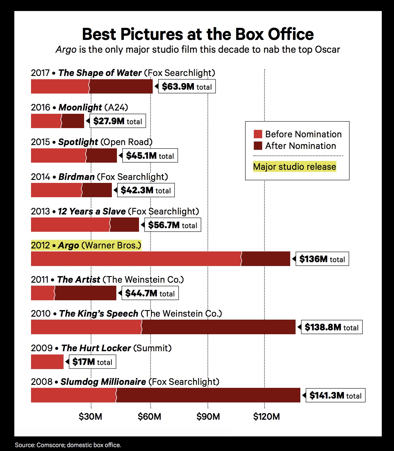 Dự án tỷ đô cuối cùng từng nhận giải Oscar chính là The Lord of the Rings: The Return of the King hồi năm 2004. Ngoài ra, hãng phim lớn duy nhất từng đoạt giải Oscar trong thập kỷ vừa qua chính là Warner Bros với tác phẩm Argo của Ben Affleck trong năm 2013.