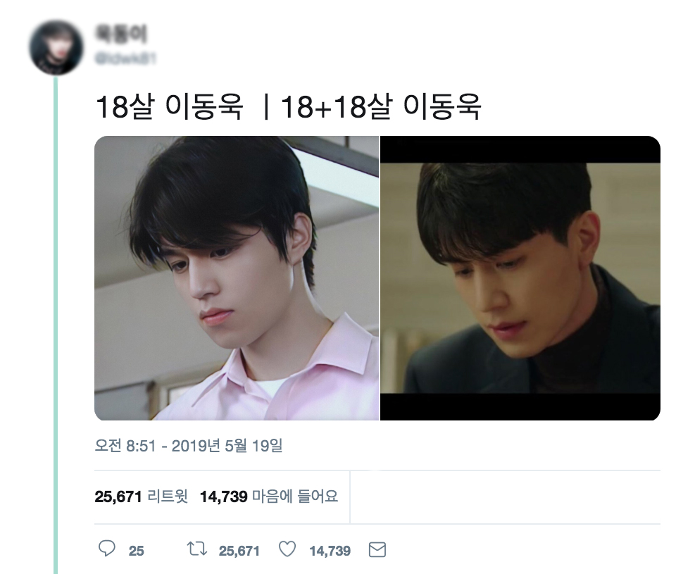 Gần đây lan truyền nhanh chóng là hai bức ảnh so sánh Lee Dong Wook từ cùng một góc độ. Dòng tweet đã viết: “Lee Dong Wook 18 tuổi vs 18 + 18 Lee Dong Wook” và kết quả thật đáng sợ vì Lee Dong Wook trông giống như thể hầu như không già đi chút nào.