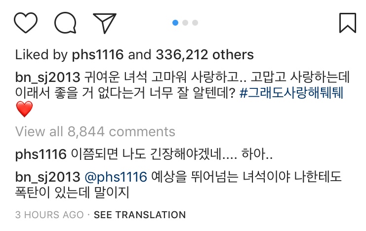 Thấy bài đăng của Seo Joon, ngay lập tức Park Hyung Sik vào bình luận: “Đến nước này thì chắc em cũng phải căng thẳng là vừa… Haiz…”. Nam diễn viên liền trả lời: “Nó là cái thằng chẳng biết đường nào mà lần đâu, nó còn dám bùng nổ với anh nữa cơ mà”.