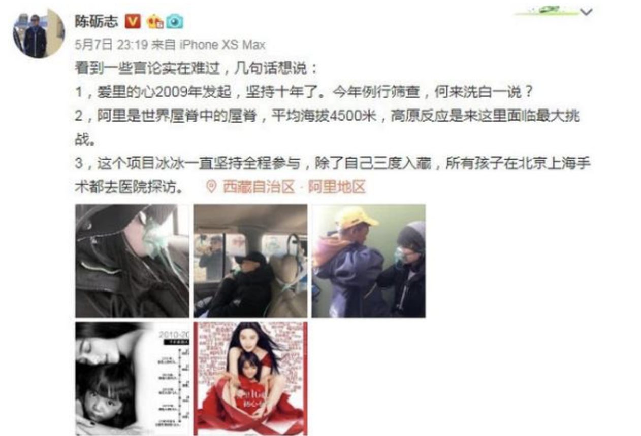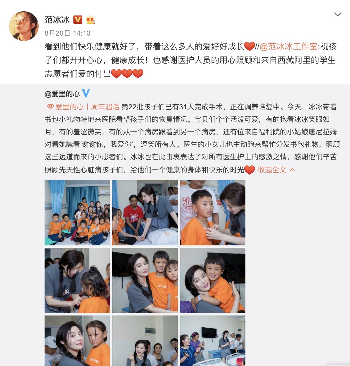 Ngày 20/8, Phạm Băng Băng mang theo mấy món quà nhỏ đến thăm những đứa trẻ vừa mới phẫu thuật xong. Mấy đứa trẻ thấy Phạm Băng Băng rất vui mừng, thậm chí còn nói lớn “Con yêu cô, cảm ơn cô”. Phạm Băng Băng đặc biệt cảm ơn bác sĩ và y tá và rất cảm kích họ, nhiều người nói cô rằng người vừa đẹp, tính lại tốt. Sau đó Phạm Băng Băng chia sẻ lại bài viết trên Weibo, cô công khai phản hồi về việc người khác nói cô mượn chuyện này để tẩy trắng: Nhìn thấy mấy đứa nhỏ vui vẻ, mạnh khỏe là tốt rồi.