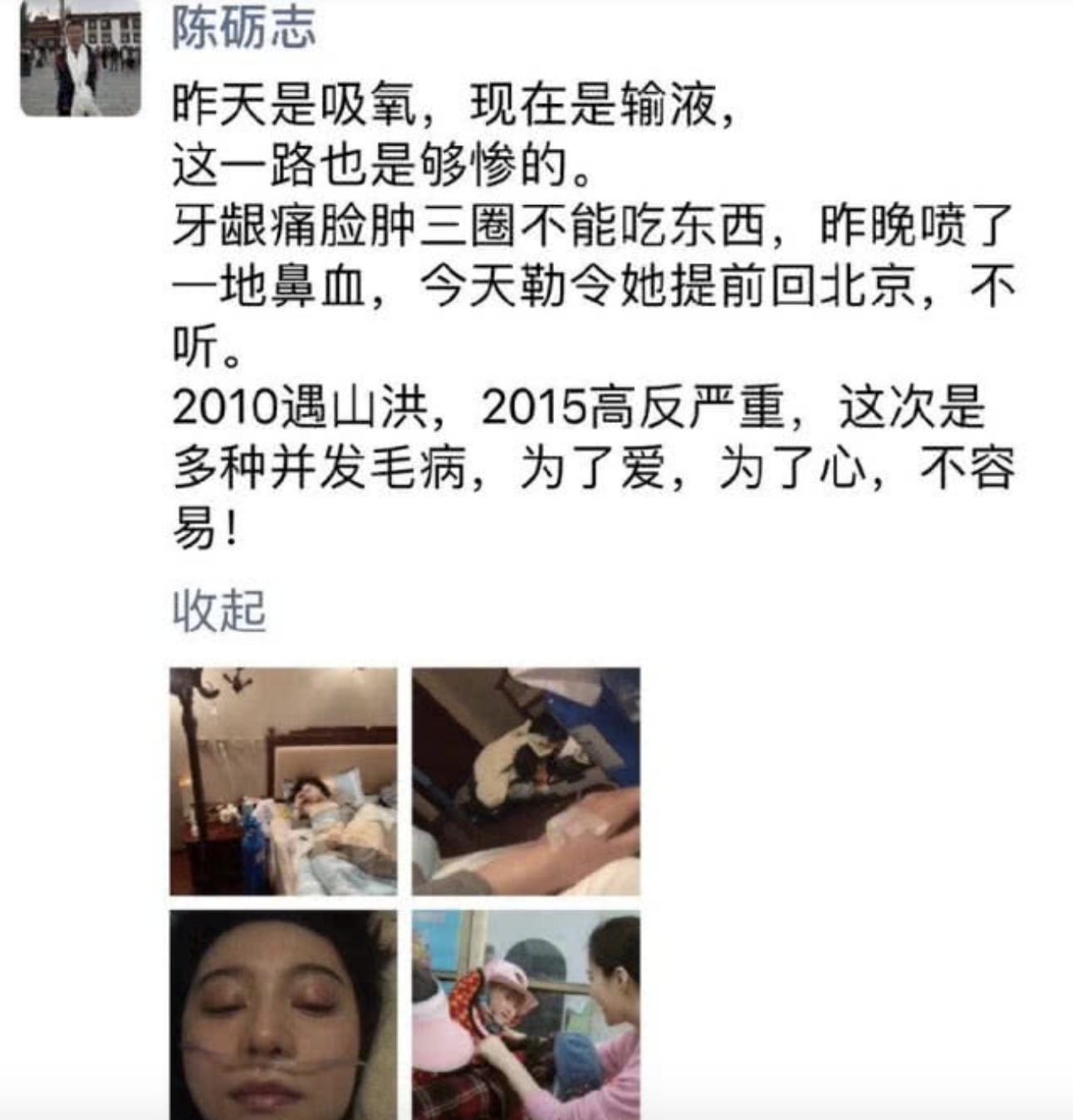 Trong thời gian gặp phải chuyện không mấy tốt đẹp nhưng Phạm Băng Băng vẫn như cũ đích thân đi đến Tây Tạng để làm công ích. Ngay trong lúc này, bệnh của Phạm Băng Băng tái phát và không thể không dùng đến máy thở oxi.