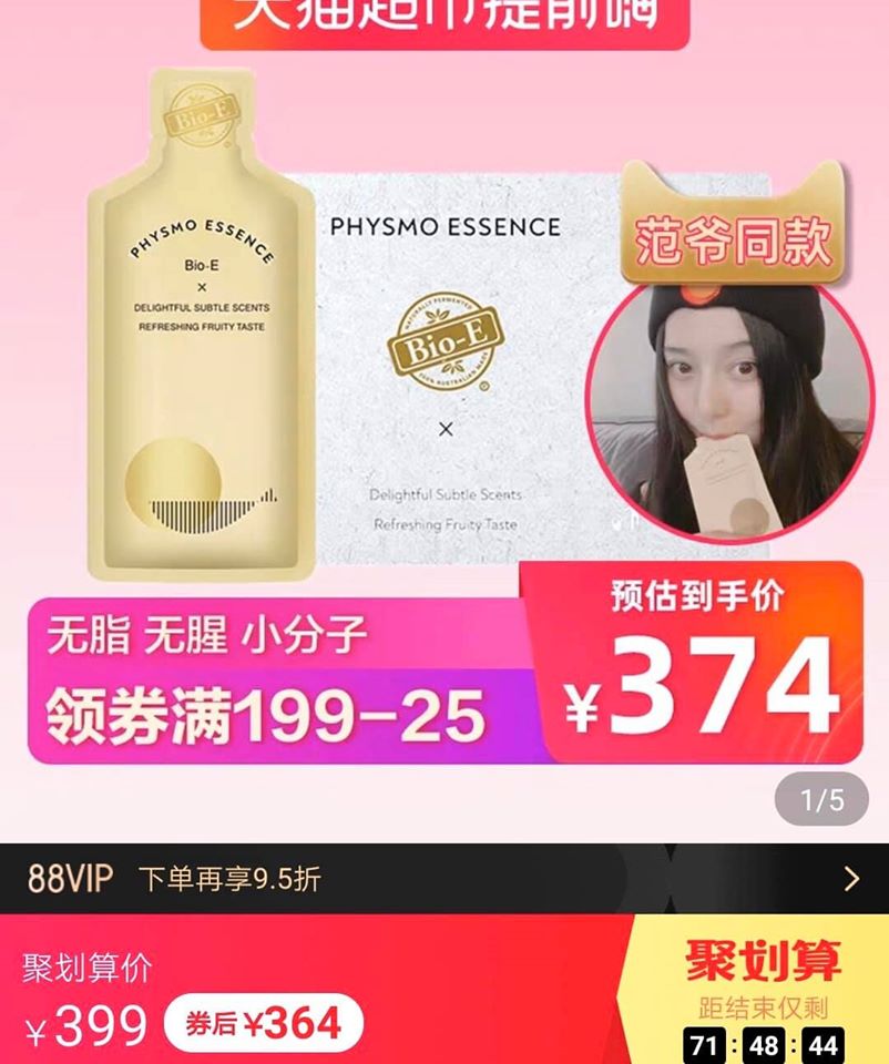 Trong loạt ảnh selfie mừng Halloween, Phạm Băng Băng cầm một gói Essence (loại dưỡng da chuyên sâu ở dạng sữa lỏng). Ngay lập tức, hãng này đã chộp thời cơ đăng tải bán sản phẩm trên mạng với giá 374 NDT (~ 1,2 triệu đồng).