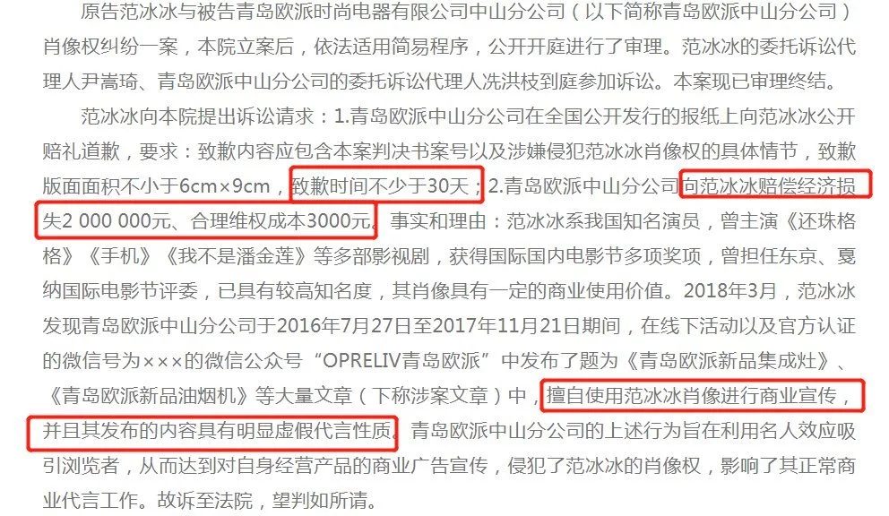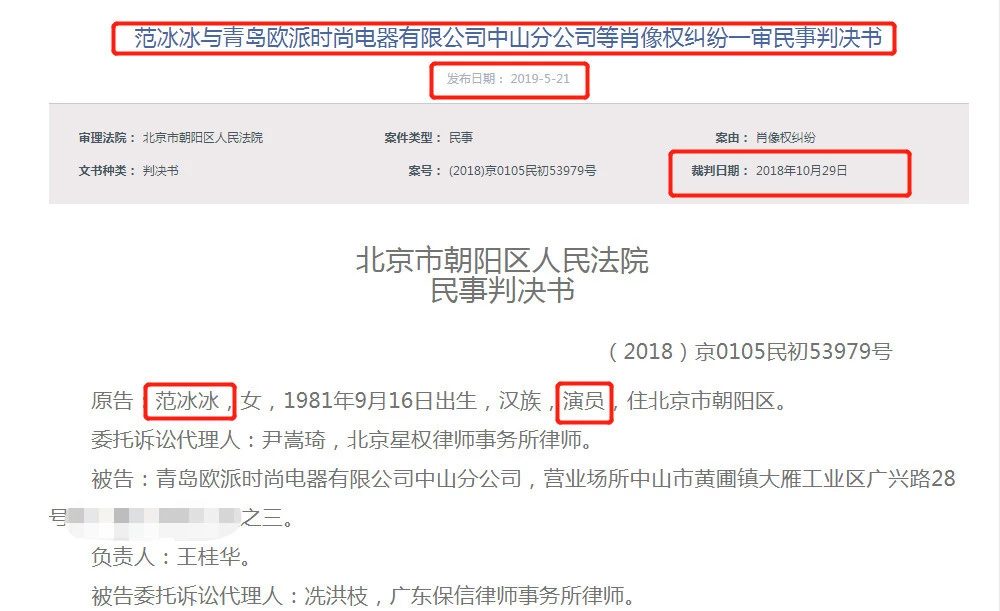 Ngày 21 tháng 5, tòa án nhân dân khu Triều Dương Bắc Kinh đã công bố một án văn dài với nội dung một cửa hàng khi chưa thông qua sự đồng ý của Phạm Băng Băng đã tự ý sử dụng hình ảnh của cô để tiến hành tuyên truyền thương mại, đồng thời trên tấm poster tuyên truyền đó có cả chữ ký viết tay của Phạm Băng Băng. Phạm Băng Băng vì bảo vệ quyền lợi chân dung của mình đã hướng đến tòa án yêu cầu cửa hàng đó công khai xin lỗi và bồi thường, phí bồi thường tổn thất kinh tế là 2 triệu NDT và phí duy quyền hợp lý là 3000 tệ.