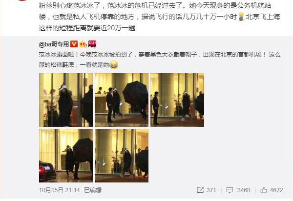 Lần xuất hiện đầu tiên của Phạm Băng Băng sau 4 tháng mất tích vào ngày 15.10 tại sân bay dành cho phi cơ cá nhân của giới nhà giàu Trung Quốc ở Bắc Kinh. Điều này chứng tỏ Phạm Băng Băng phải sở hữu máy bay cá nhân hoặc bỏ ra chi phí lớn để thuê riêng 1 chiếc. Chi phí thuê hoặc mua nhiên liệu cho chuyến bay từ Bắc Kinh đến Thượng Hải tốn ít nhất 200.000 NDT (gần 700 triệu đồng). Trong khi đó, trên Weibo trợ lý trang điểm của Phạm Băng Băng lại xuất hiện những hình ảnh tại Anh, Pháp trước vài ngày mà cô nàng chính thức lộ diện với công chúng.