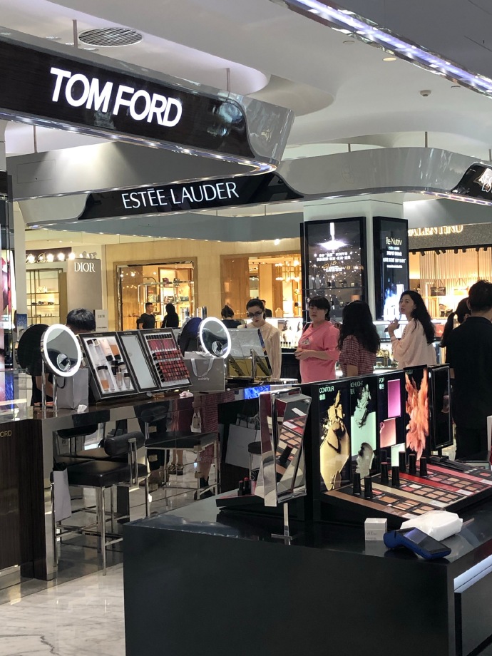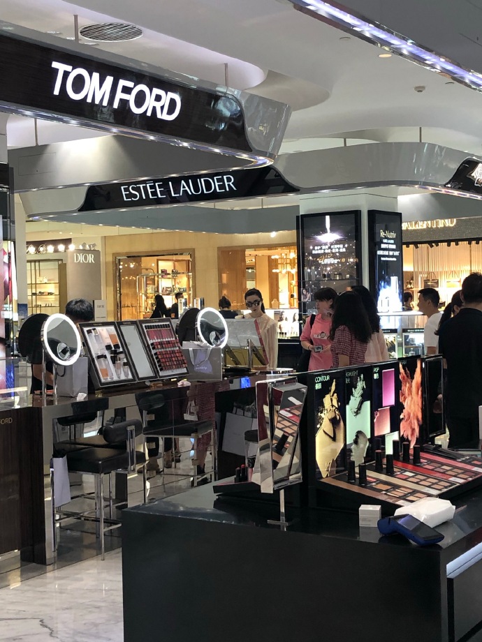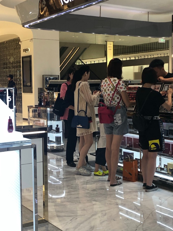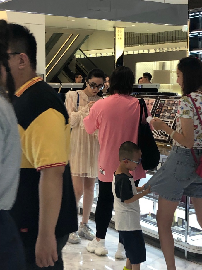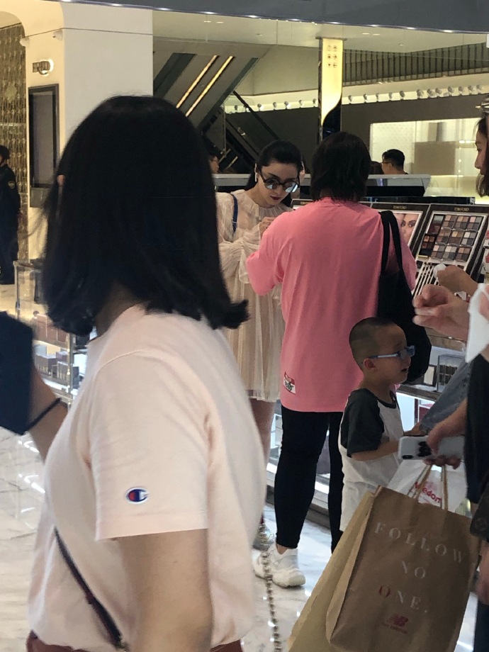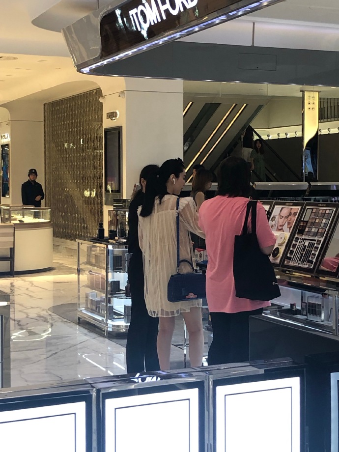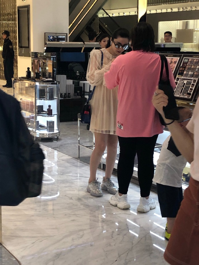 Nàng đại hoa đán xuất hiện cùng với trợ lý của mình đến một cửa hàng mỹ phẩm nổi tiếng, chăm chú đứng chọn và thử màu son. Nữ diễn viên mặc chiếc váy ngắn màu trắng, đeo chiếc kính mát cỡ lớn cùng với tai nghe, trò chuyện cùng với nhân viên tư vấn.