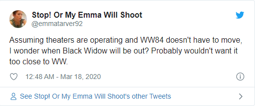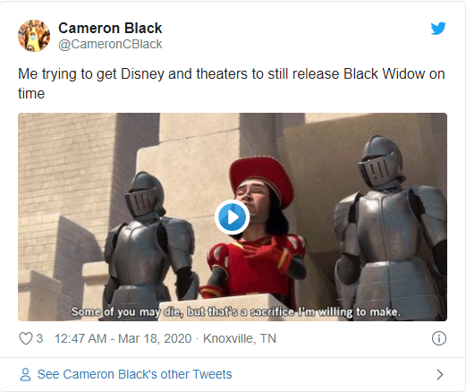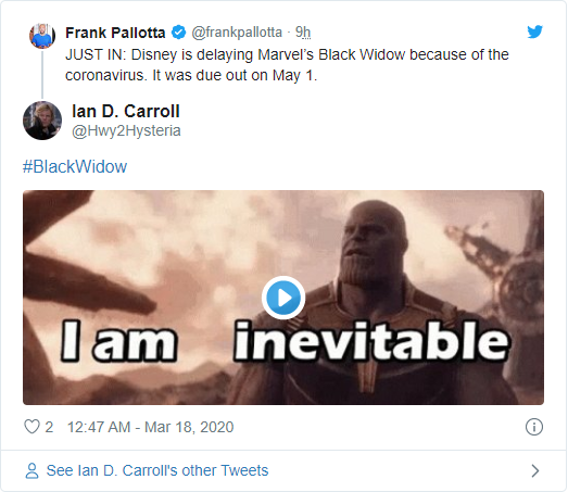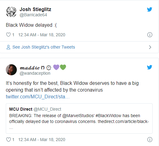 Khuyến cáo này sẽ kéo dài trong 8 tuần, đồng nghĩa với việc, hàng loạt các bom tấn điện ảnh sẽ bị dời lịch chiếu. Cuối cùng đến hôm qua, Marvel cũng công bố rằng bom tấn Black Widow, bộ phim mở đầu cho giai đoạn 4 của vũ trụ điện ảnh Marvel, sẽ bị dời lịch công chiếu. Và sau đây là phản ứng của cư dân mạng, hay đúng hơn là các fan của Marvel.