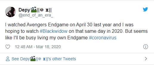 “Tôi đã xem Endgame vào ngày 30/4 năm ngoái và mong là có thể xem Black Widow cũng vào ngày này năm nay. Nhưng có vẻ như tôi sẽ vẫn phải xem lại Endgame rồi.”