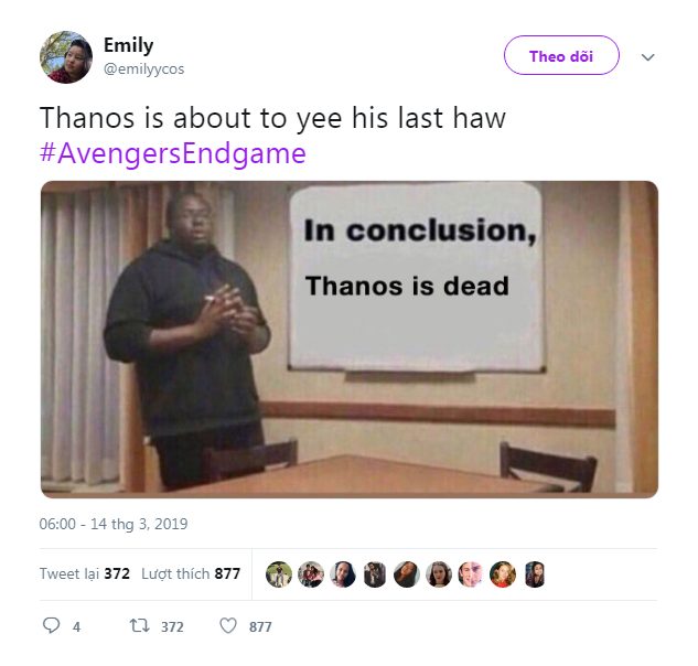 Avengers: Endgame là phần tái đấu sau thất bại của nhóm Avenger trong Infinity War. Với sự giúp sức của những cái tên mới lần đầu tham gia, trong đó có Captain Marvel, các fan đang ủng hộ hết mình, bỏ phiếu cho Thanos bại trận trong cuộc chiến sắp tới.