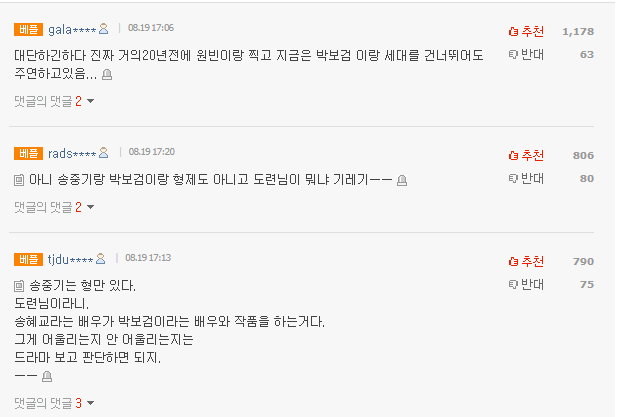 7. [+82, -24] Không phải có một số ý kiến phản ứng thái quá hay sao? Họ chỉ có khoảng cách 10 tuổi thôi mà … Nếu đó là một vấn đề lớn, vậy còn Lee Byung Hun và Kim Tae Ri thì sao? Họ là ông nội và cháu gái chắc ㅋㅋ