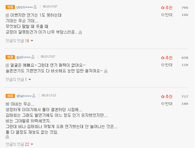 3. [+658, -118] Cô ấy đẹp ~ nhưng diễn xuất không có chút quyến rũ, thuyết phục. Biểu cảm gương mặt giống nhau cho dù cô ấy hạnh phúc hay buồn. Tất cả những gì cô ấy làm là di chuyển đôi mắt và đôi môi của mình ~