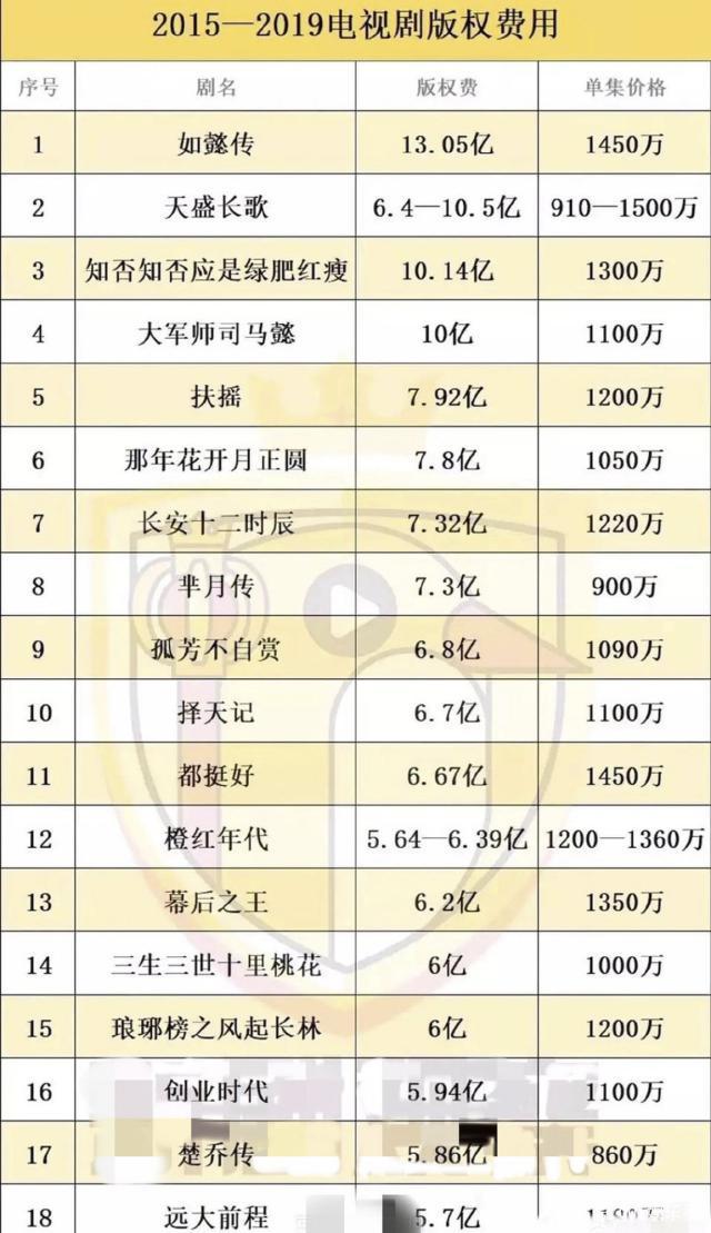 Đầu tiên bộ phim truyền hình có phí bản quyền cao nhất trong bảng chính là phim Thanh cung - Hậu cung Như Ý truyện đạt 1,305 tỷ NDT, giá từng tập là 14,5 triệu NDT. Như mọi người đều biết, Hậu cung Như Ý truyện có cốt truyện cùng với Diên Hi công lược - bộ phim vô cùng nổi tiếng trước đó, dẫn đến danh tiếng của Hậu cung Như Ý truyện trở nên “bình bình”, không hot như dự đoán.