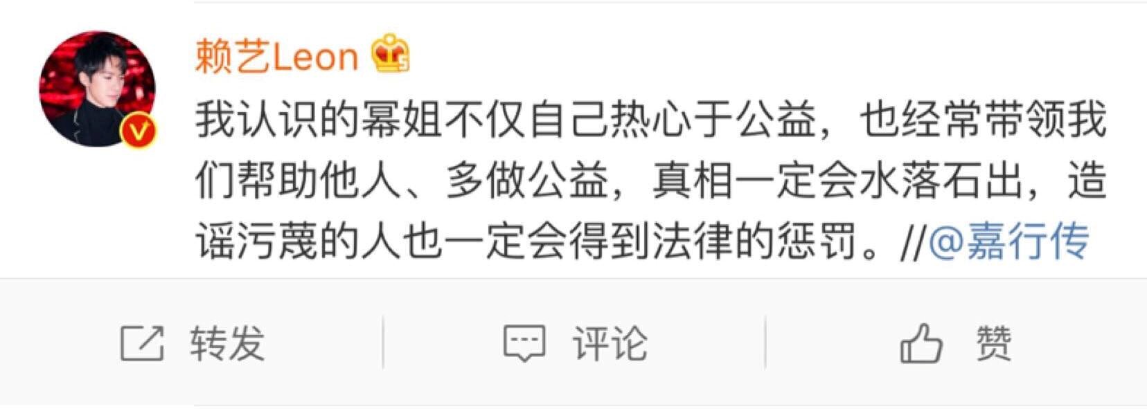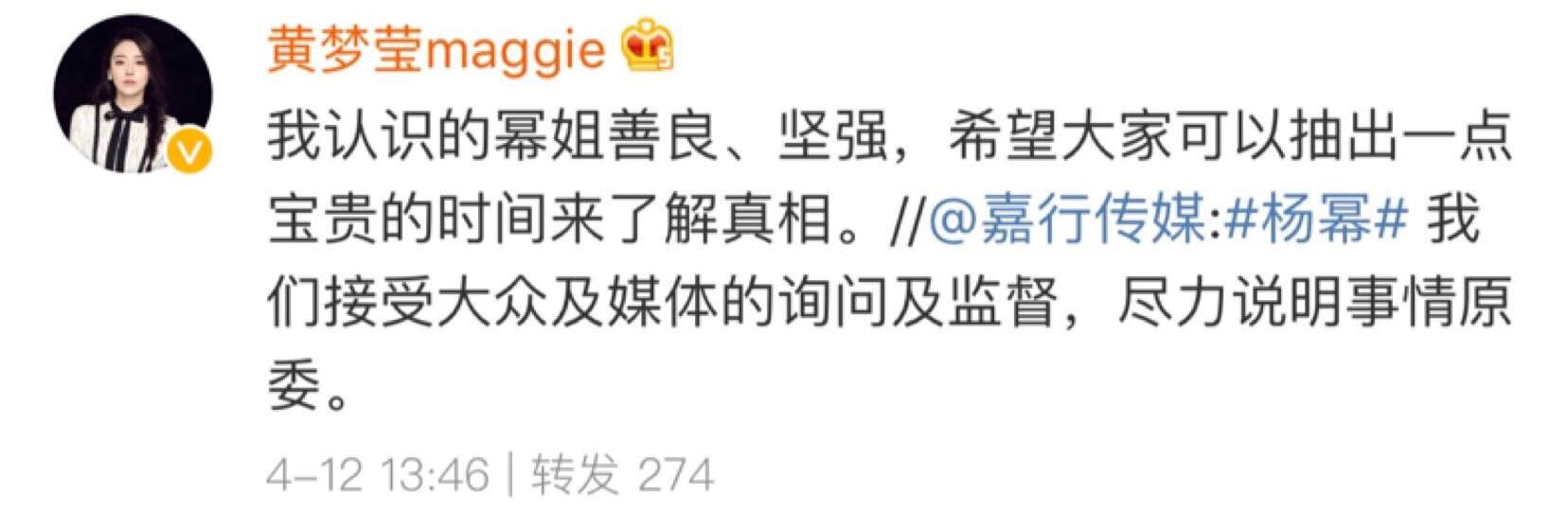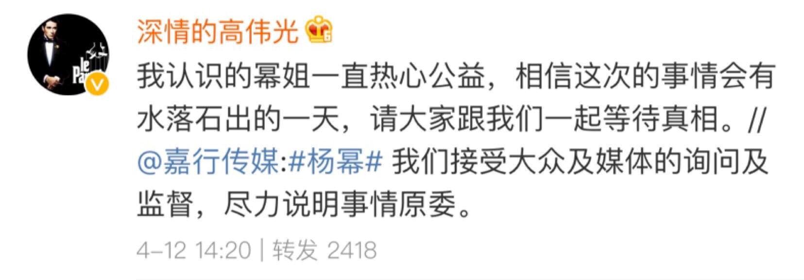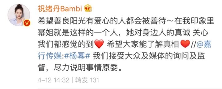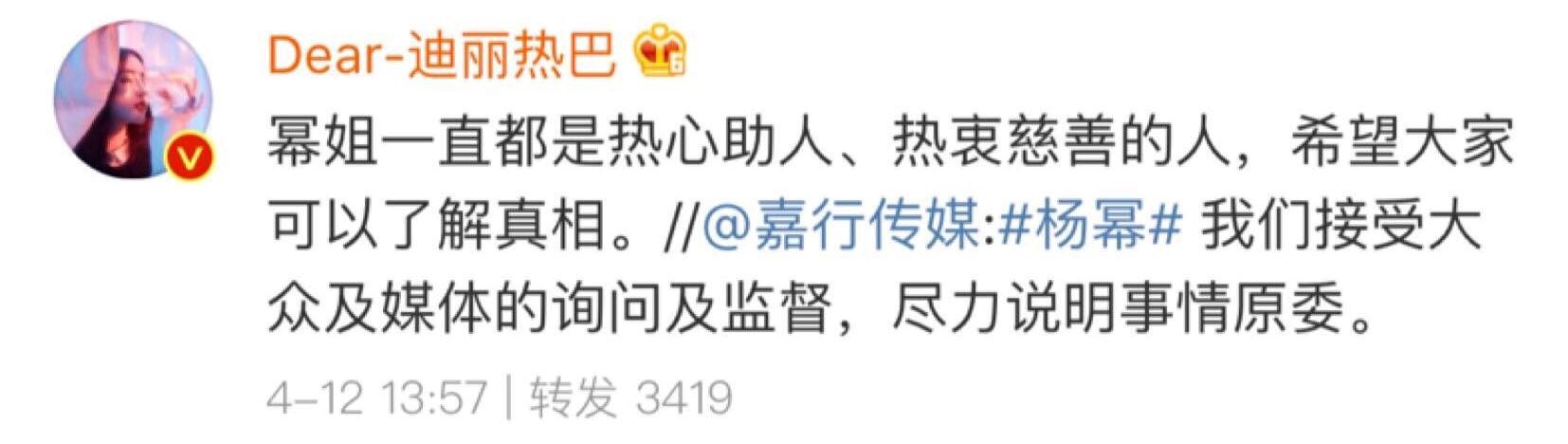 Địch Lệ Nhiệt Ba, mỹ nhân Tân Cương hiện đang được Gia Hành push mạnh đã đăng weibo và nói rằng: “Mịch tỷ luôn là một người nhiệt tình giúp người, thích làm từ thiện. Hi vọng mọi người có thể nhìn thấy chân tướng”.
