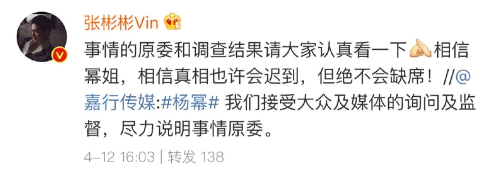 ‘Chiến Phong’ Trương Bân Bân đã cập nhật weibo của mình: “Sự tình ngọn nguồn và kết quả điều tra xin mọi người xem xét thật nghiêm túc. Tin tưởng Mịch tỷ, tin rằng chân tướng có thể sẽ đến trễ nhưng tuyệt đối không vắng mặt”.