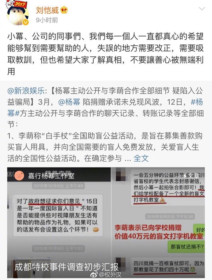 Ngay sau đó, Lưu Khải Uy đã share về weibo và cập nhật caption: “Tiểu Mịch, các đồng nghiệp công ty, mỗi người chúng ta vẫn luôn hi vọng có thể giúp những người cần giúp, sai chỗ nào sửa chỗ đó, cần phải tiếp thu bài học. Nhưng tôi cũng hi vọng các bạn biết sự thật, đừng để lòng tốt bị lợi dụng”.