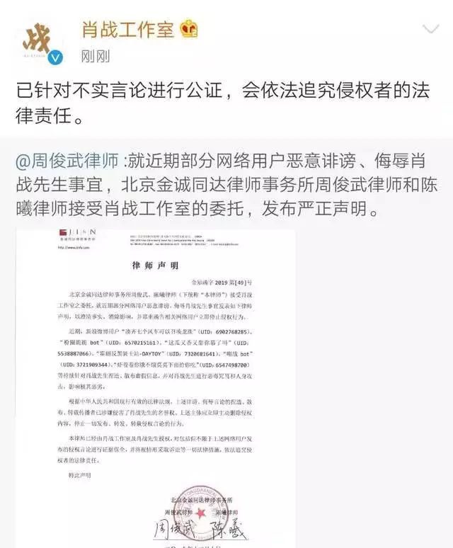 Phía Tiêu Chiến sẽ đem chuyện này giải quyết theo pháp luật, dựa theo luật để truy cứu trách nhiệm pháp lý với những kẻ đã xâm phạm quyền danh dự: “Đã tiến hành công chứng với những ngôn luận không đúng sự thật, sẽ dựa theo pháp luật truy cứu trách nhiệm”.