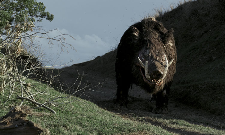 Ác thú heo rừng xuất hiện rõ nét nhất khi một nhóm 6 người tắm ở hồ nước cạnh rừng rồi anh chàng cao to hơn người Bernie (Nathan Jones) lái xe đi tìm hai ông lão địa phương và heo rừng xuất hiện hất tung xe của anh chàng. Hai người đàn ông trong nhóm là Robert (Hugh Sheridan) và Bruce (Bill Moseley) đi tìm nguyên nhân của một tiếng động nghe như tiếng nổ để rồi cãi nhau chí chóe trên đường đi và rồi khi ác thú xuất hiện thì Bruce không ngừng tỏ vẻ ngạc nhiên thoảng thốt xen lẫn sự thú vị trong khi Robert đẩy Bruce ngã sấp mặt về phía trước rồi quay lưng bỏ chạy. Trong tình huống đó Bruce vẫn kịp thốt lên câu chửi rủa sự hèn nhát của người bỏ chạy trước khi bị quái vật sát hại.