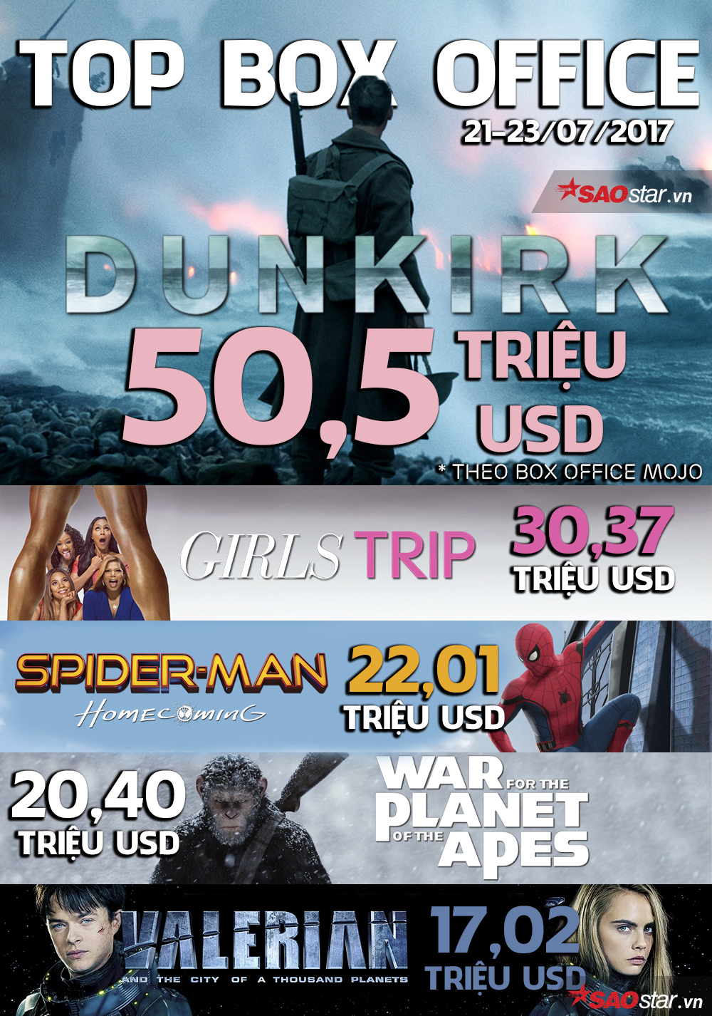 Phim về đề tài chiến tranh của đạo diễn Christopher Nolan (người đứng sau sự thành công của triology Batman) - Dunkirk đã giành chiến thắng tại thị trường Bắc Mỹ trong 3 ngày cuối tuần vừa qua, từ 21 - 23/07. Đây cũng là phim điện ảnh đầu tiên giành vị trí đứng đầu trong suốt một thời gian dài từ tháng 3 cho đến nay, mà không phải xuất phát từ một franchise nổi tiếng. Với hơn 50 triệu USD tại Bắc Mỹ, tuy không phải một con số “khủng” như nhiều sản phẩm bom tấn siêu anh hùng đã làm được, nhưng Dunkirk đã chứng minh sức ảnh hưởng của nó bởi chất lượng bộ phim, thay vì là từ một thương hiệu với 3,720 phòng chiếu tại Mỹ.