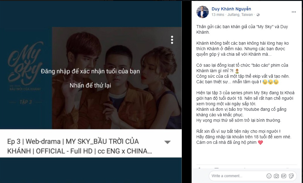 Các bạn thiệt sự… nhẫn tâm quá ! ????????????Hiện tại tập 3 của series phim My Sky đang bị khoá giới hạn độ tuổi dưới 18. Nên sẽ rất hạn chế người xem trong một vài ngày sắp tới.