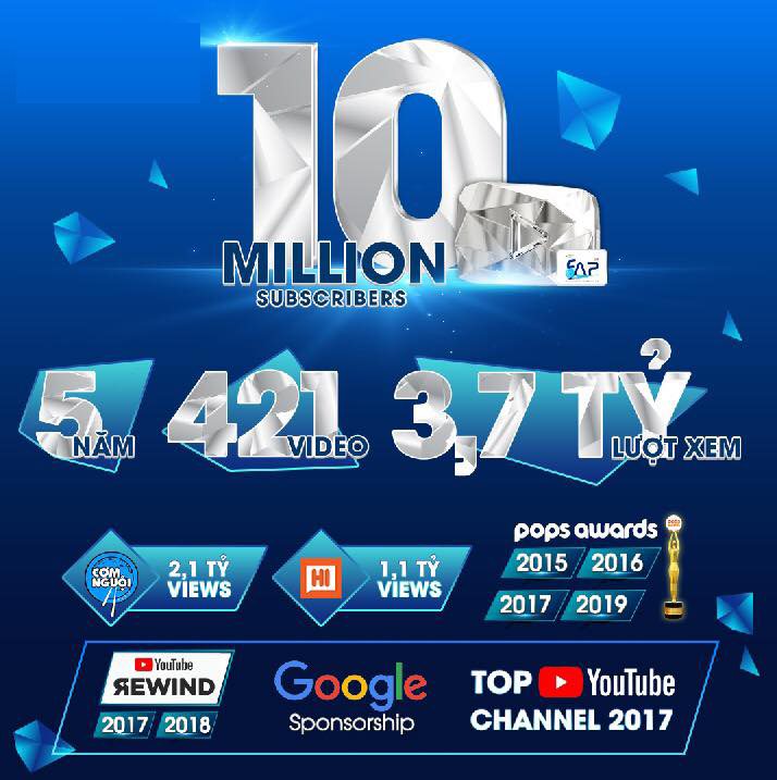 Ngày 17/9, cộng đồng mạng xôn xao khi hay tin Kênh FAPTV chính thức cán mốc 10 triệu lượt theo dõi (subscribe) trên youtube. Với thành tích này, FAPTV cũng trở thành kênh youtube đầu tiên của Việt Nam đoạt được nút kim cương (chứng nhận hơn 10 triệu lượt theo dõi) từ trang mạng xã hội chia sẻ video lớn nhất thế giới này.