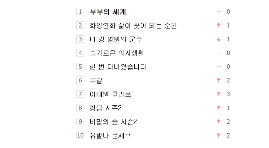Không quá bất ngờ khi phim The World of the Married (Thế giới hôn nhân) của Kim Hee Ae và Park Hae Joon tiếp tục trụ vững vị trí đầu bảng tuần tuần này. Bộ phim tiếp tục thu hút được nhiều sự quan tâm, theo dõi của khán giả ở những tập mới nhất. Trong tuần vừa qua bộ phim cũng đã đạt được rating cao nhất 22.9% kể từ khi lên sóng, vượt qua phim Hạ cánh nơi anh (21.7%), để vươn lên vị trí thứ 2 trong top những bộ phim có rating cao nhất mọi thời đại trên đài cáp, chỉ sau phim SKY Castle.