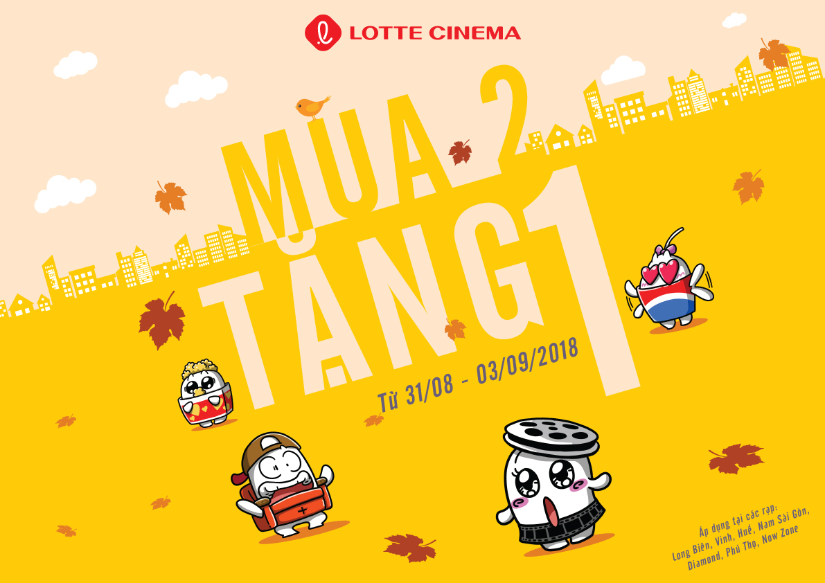 Từ ngày 31.08 - 03.09.2018 khách hàng mua 2 vé xem phim nhận ngay 1 vé xem phim miễn phí. Chương trình hiện đang chạy tại một số cụm rạp của Lotte Cinema.
