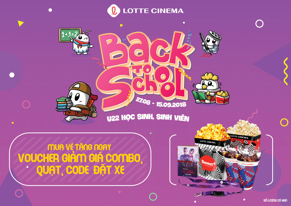 Ưu đãi không dừng ở đó, từ ngày 27.08.2018 - 15.09.2018 chương trình khuyến mãi dành cho ngày tựu trường, khách hàng thành viên dưới 22 tuổi khi mua 2 vé xem phim bất kì sẽ nhận được các phần quà như voucher giảm giá bắp nước còn 45k, voucher giảm 20k cho chuyến đặt xe, dây đeo, sổ ghi chú, và hàng ngàn quà tặng có giá trị khác.