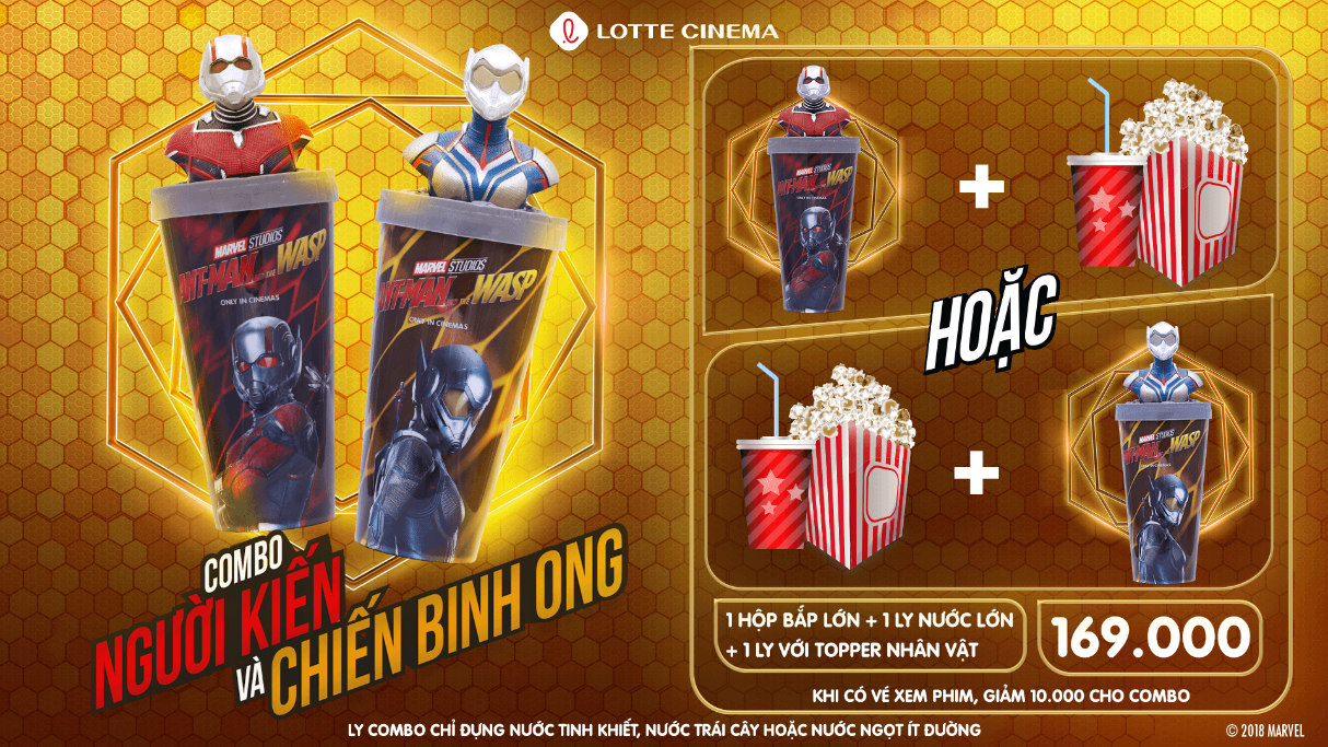 Để chào đón bom tấn Antman and The Wasp, Lotte cinema ra mắt combo cực chất với giá bán 159k bao gồm 1 ly phim kèm topper - 1 trong 2 mẫu tự chọn, kèm 1 bắp lớn và 1 nước lớn. Giảm 10k cho combo khi có vé xem phim bất kỳ.