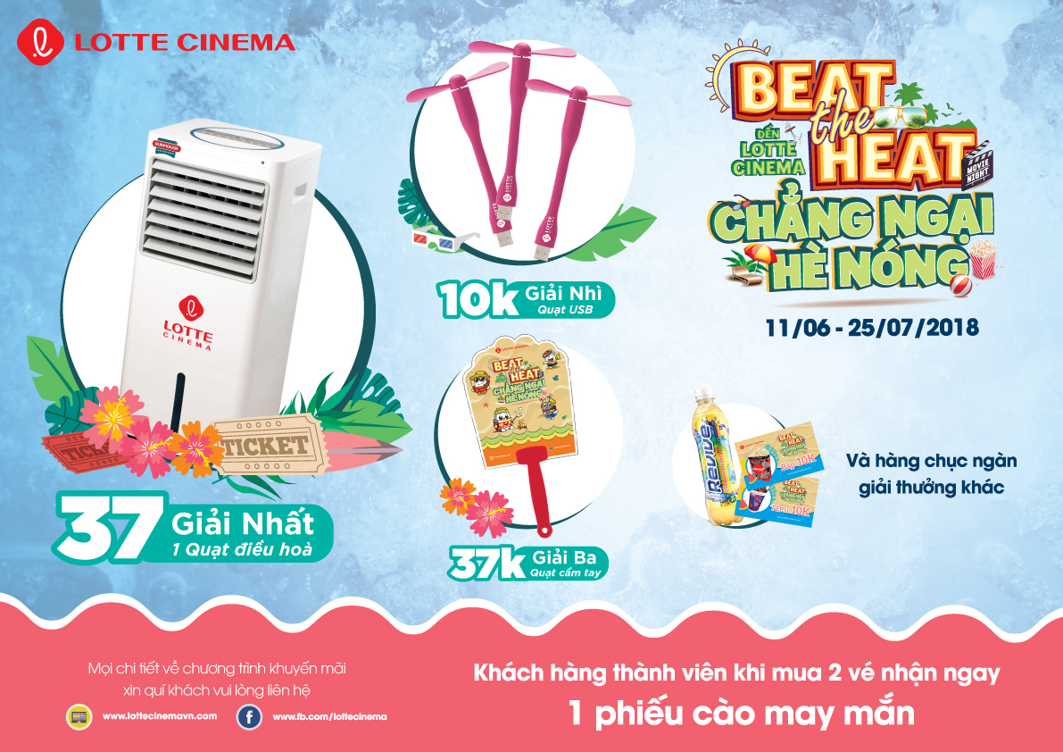 Thưởng thức phim hay cũng đừng quên chương trình Beat the Heat chẳng ngại hè nóng vẫn đang diễn ra. Trong tháng 7 cụ thể các khách hàng thành viên của Lotte cinema trên toàn quốc có cơ hội nhận được 1 thẻ cào trúng 100% các phần quà giá trị và hấp dẫn, như: quạt usb, quạt cầm tay dễ thương, hàng ngàn chai chanh muối, và đặc biệt là máy quạt điều hòa vẫn đang đợi các bạn rinh về.