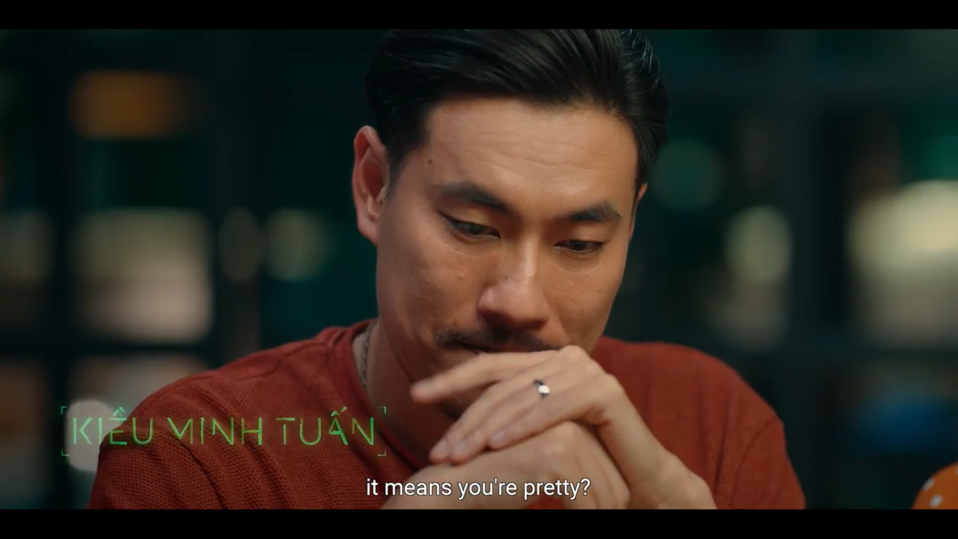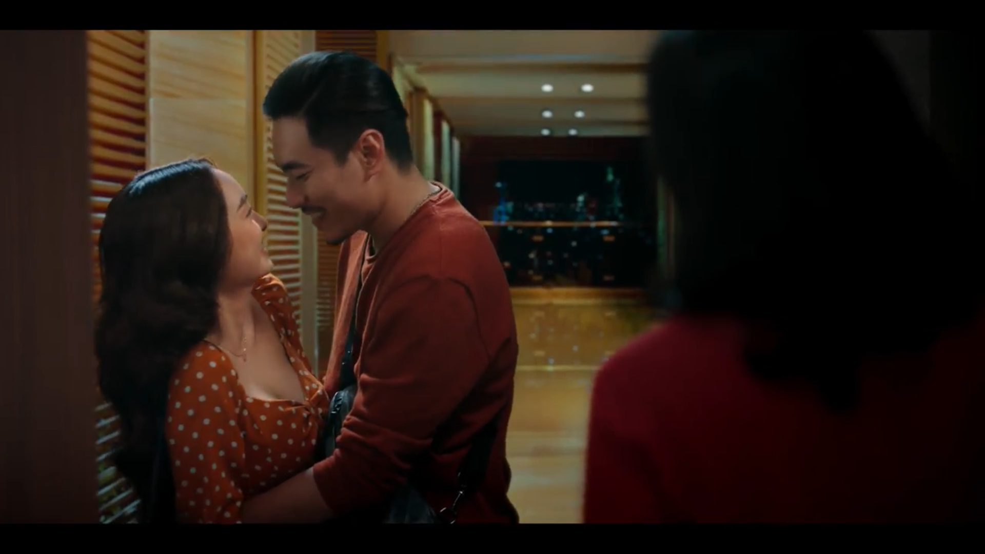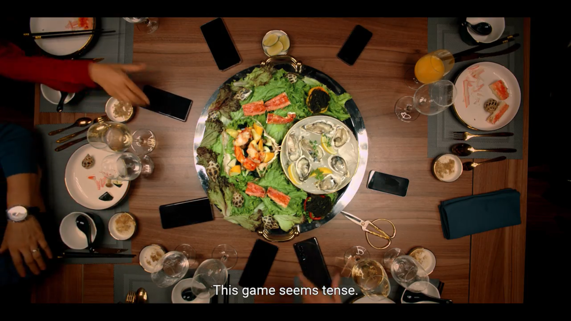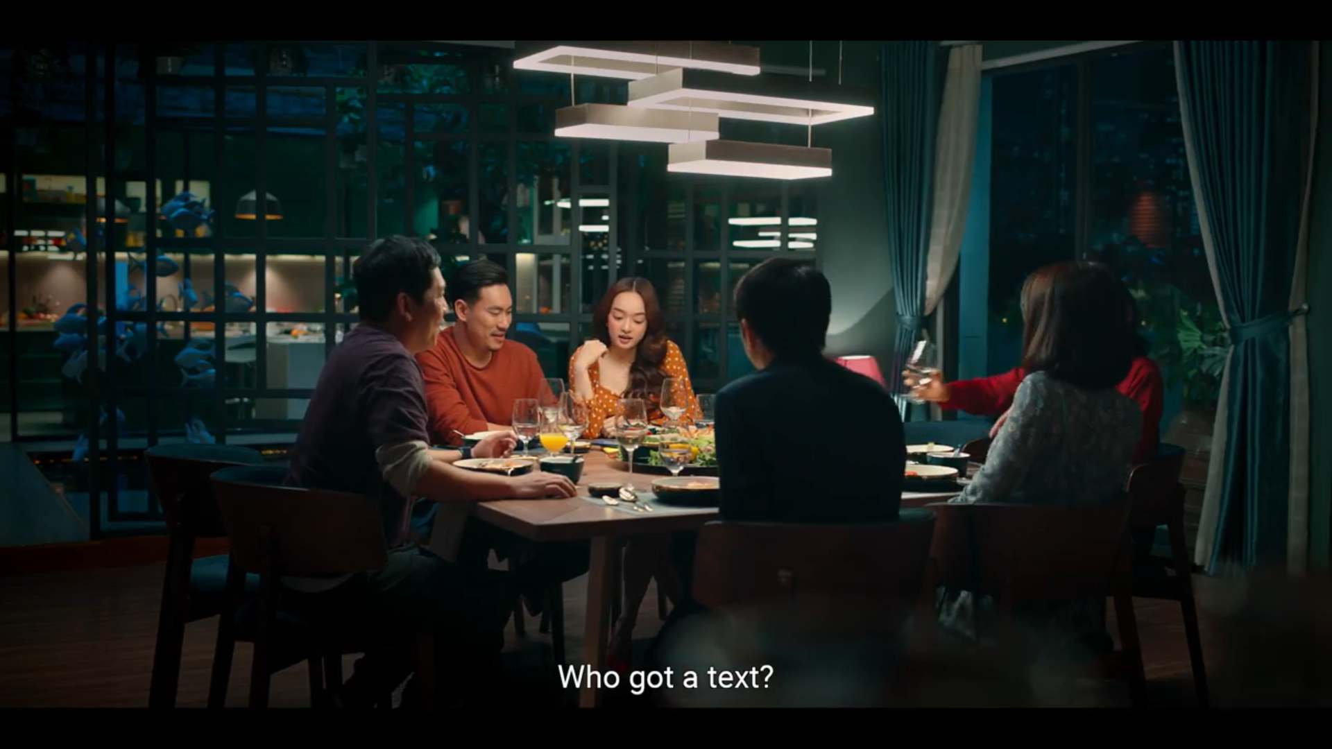 Nội dung tin nhắn có lẽ chính là thứ khiến tất cả các nhân vật bất ngờ đến không nói lên lời, nhưng tại sao lại vậy? Phía xa xa, trên nền trời, một mặt trăng đỏ rực màu máu xuất hiện đằng sau biểu cảm có phần hài hước của các diễn viên, thiết lập một bầu không khí tương phản đầy mỉa mai, trào phúng.