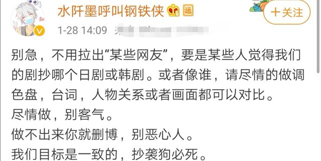 “Đừng gấp, đừng có lôi kéo một số cư dân mạng khác, nếu như có một số người cảm thấy phim của chúng tôi sao chép bộ phim nào của Hàn Quốc hay Nhật Bản, hay có giống ai thì xin cứ tự nhiên làm phép so sánh mối quan hệ nhân vật, lời thoại, hay các phân cảnh… Cứ tự nhiên làm xin đừng khách sáo. So sánh không ra thì bạn hãy xóa weibo, đừng ác ý với người khác. Mục tiêu của chúng tôi chỉ có một, sao chép coi như tác phẩm vứt đi”. Tài khoản này cũng đã được chứng thực chính là biên kịch của bộ phim, có thể thấy ông vô cùng tức giận với những nghi ngờ này.