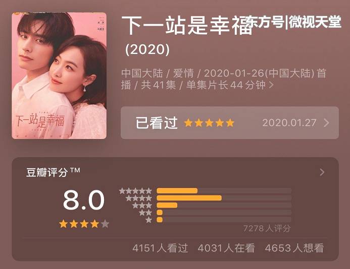 Dịp tết năm nay có rất nhiều phim truyền hình được ra mắt. Tác phẩm dự đoán sẽ hot nhưng cuối cùng lại không tạo được tiếng vang, ngược lại bộ phim Trạm kế tiếp là hạnh phúc do Tống Thiến và Tống Uy Long đóng chính bất ngờ nổi tiếng. Vào ngày thứ ba phát sóng, phim đã có điểm đánh giá trên Douban với kết quả khá cao 8.0 điểm. Mặc dù trước mắt, số điểm đó đã hạ xuống chỉ còn 7.7 nhưng thời gian phát sóng vẫn còn rất dài, rất có khả năng sẽ tăng thêm nữa. Cho dù có giảm phim cũng sẽ không thấp hơn 7 điểm. Đây có lẽ là bộ phim có số điểm cao nhất của Tống Thiến và Tống Uy Long kể từ khi ra mắt giới giải trí đến giờ.