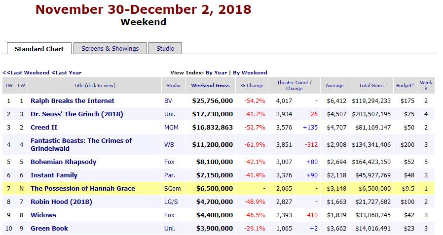 Fantastic Beasts: The Crimes of Grindelwald và Bohemian Rhapsody tiếp tục giữ vị trí thứ 4 và 5 trên Box Office tuần qua với doanh thu 3 ngày cuối tuần lần lượt là 11,2 và 8,1 triệu USD. Đến thời điểm này - sau nửa tháng trình chiếu, phần phim ngoại truyện của Harry Potter tạm hòa vốn 200 triệu USD nhờ vào thị trường quốc tế, vì tại nội địa, phim chỉ thu được 134 triệu USD. Đây là một thất bại lớn khiến nhiều người lo lắng hãng phim Warner Bros. sẽ xem xét khả năng thực hiện tiếp phần 3.