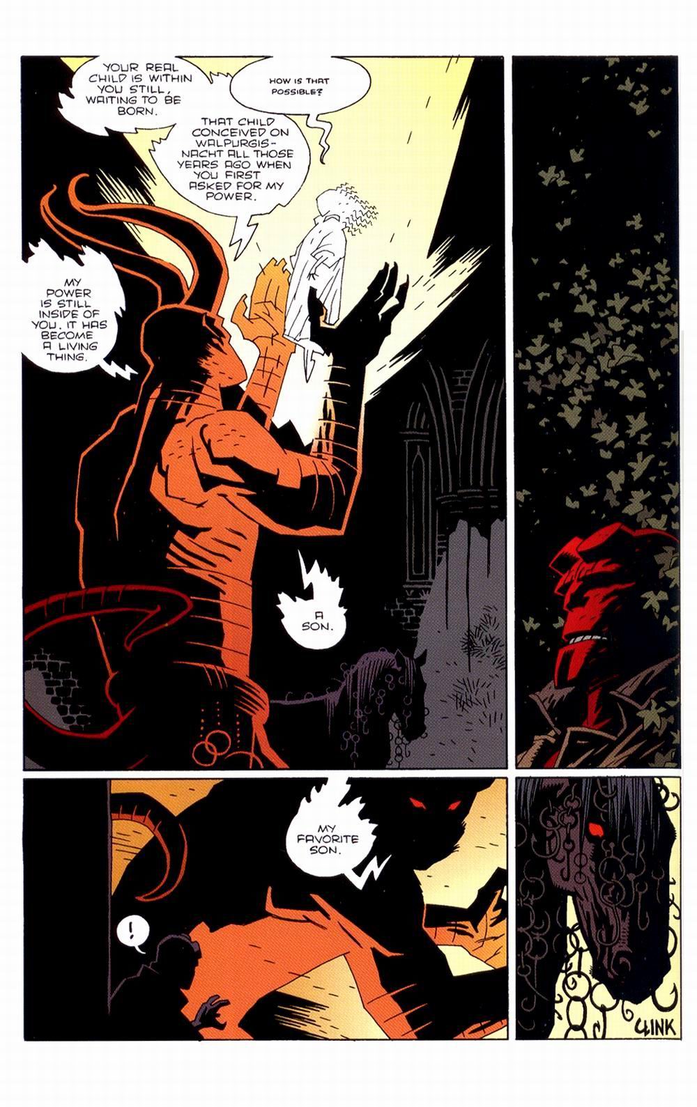Cha của Hellboy mang tên Azzael - vốn là một vị thần của nền văn minh cổ Babylon và cho tới thế kỷ XVI, hắn đã trở thành chúa tể của các phù thủy ở phía Tây Browich, Lancashire và Faversham. Tại đây, một nữ phù thủy 16 tuổi mang tên Sara Hughes đã vô cùng sùng bái hắn và đi theo con đường tà đạo của một phù thủy. Trong thời gian làm phù thủy thờ phụng Azzael, sức mạnh của hắn đã len lỏi vào trong Sara và từng bước một trở thành một sinh vật sống - hay chính là con của bà và Azzael. Tuy nhiên, bà đã sớm bỏ cuộc sống này nhưng hậu quả của nó vẫn bám theo tới tận khi Sara sắp từ trần - đứa con kia vẫn ở trong bà dù Sara không biết gì về sự tồn tại của nó cả.