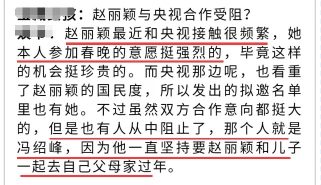 Tuy nhiên, theo nguồn tin từ người trong giới tiết lộ việc hợp tác này đã bị thất bại bởi sự ngăn cản của một người. Không ai khác chính là ông xã của nữ diễn viên - Phùng Thiệu Phong. Bởi vì Phùng Thiệu Phong một mực yêu cầu Triệu Lệ Dĩnh cùng con trai về quê cha mẹ mình để ăn tết. Có thể thấy, Phùng Thiệu Phong rất hiếu kính với cha mẹ của mình.